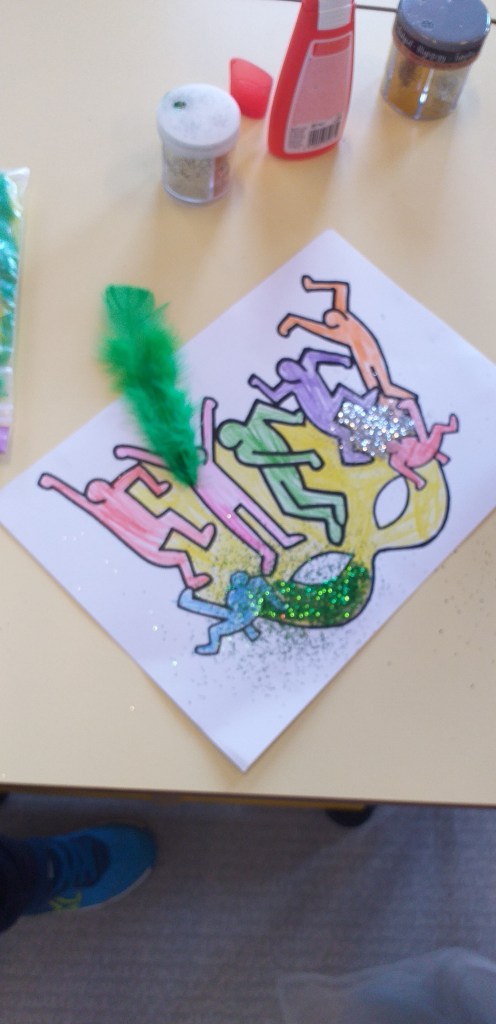 Enfin, les élèves auront pu réaliser eux-mêmes leur masque (inspiré d’artistes très connus : Joan Miro, Victor Vasarely, Piet Mondrian, Vassily Kandinsky, Robert Delauney et Keith Haring).