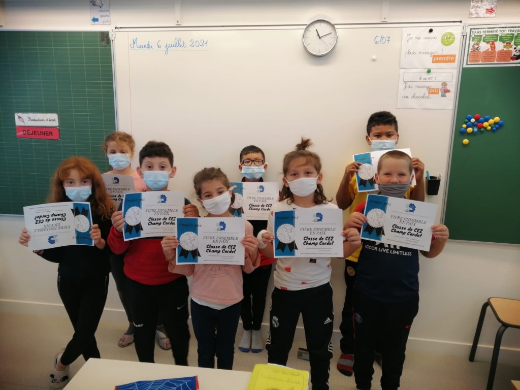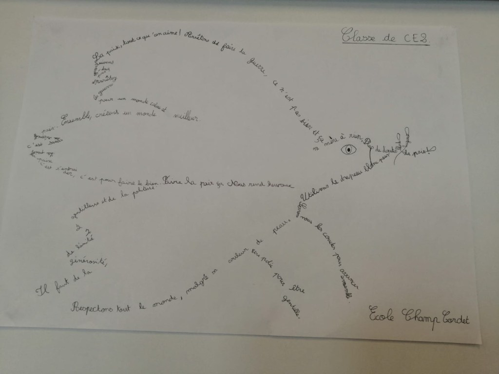 La classe de CE2 a participé au cours de l’année au prix « vivre ensemble et paix ». Ils ont produit un calligramme en forme de colombe.