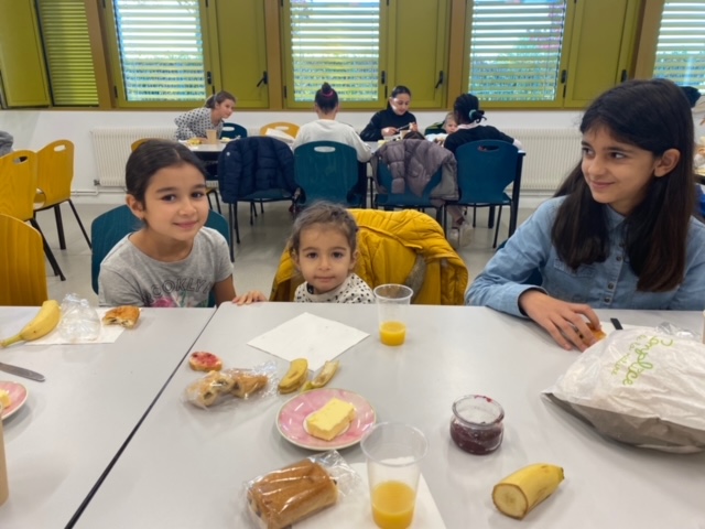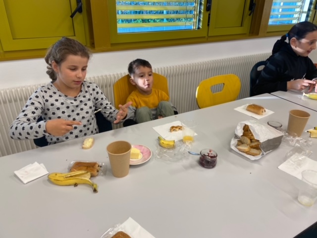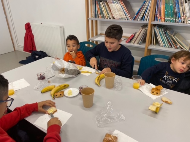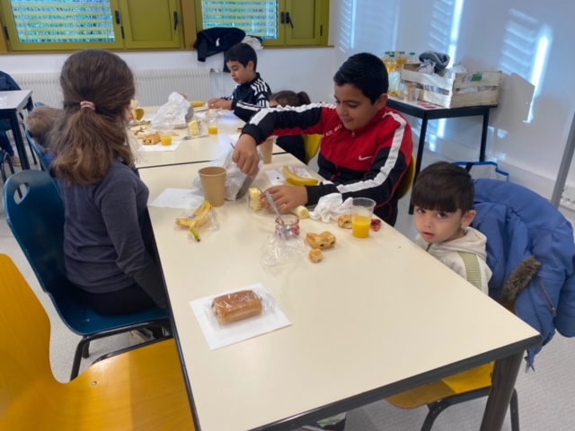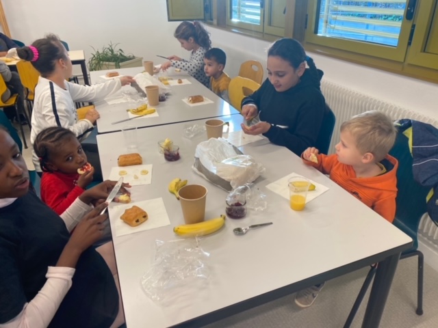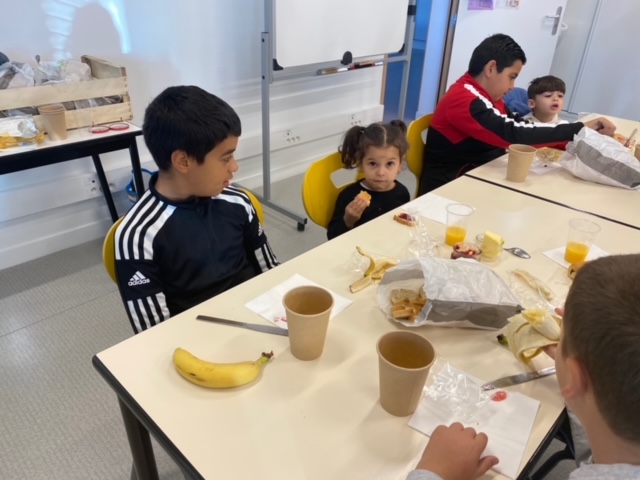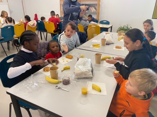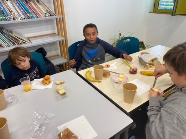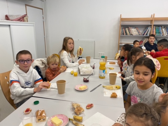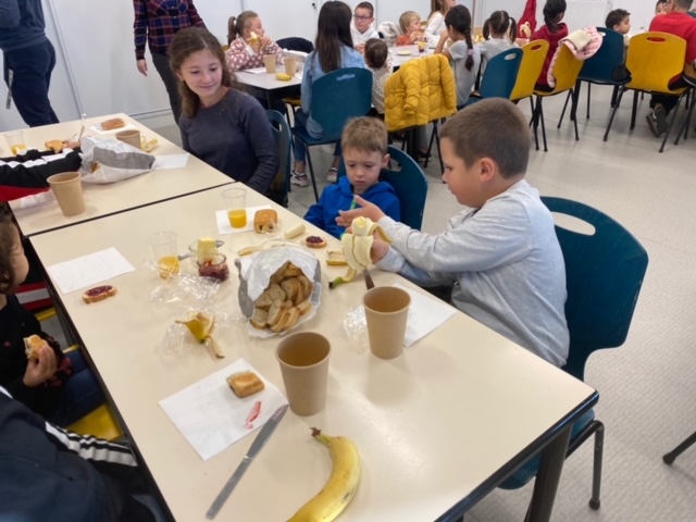 En ce dernier jour d’école avant les vacances d’automne, les élèves des classes de TPS/PS et de CM1/CM2 ont pu partager un petit déjeuner en arrivant à l’école. Au menu : jus d’orange, pain au chocolat, pain, beurre, confiture, banane.