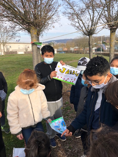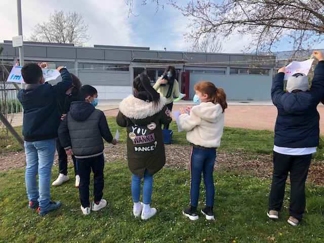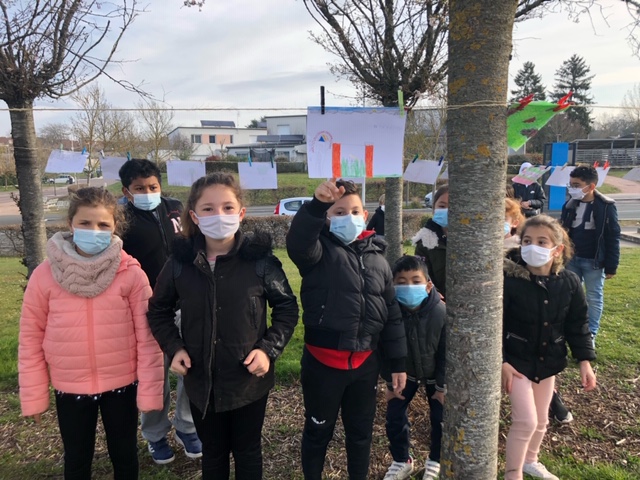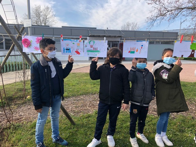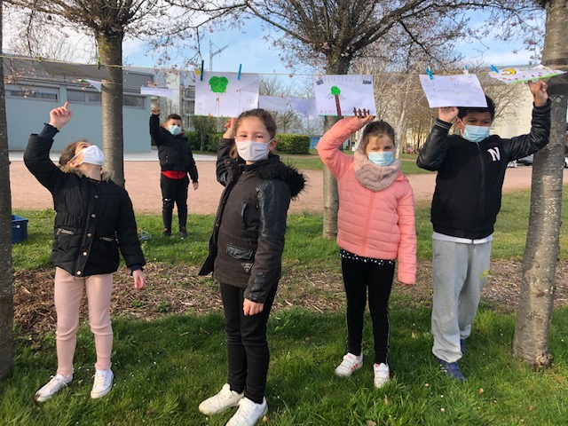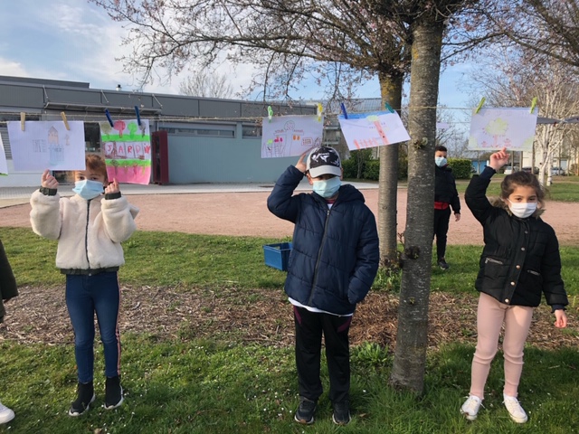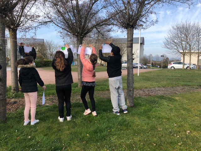 Le 25 mars, armée de pinces à linge, la classe de CE2 s’est rendue à la maison des familles pour suspendre les œuvres préparées en classe sur le thème du « jardin suspendu », lors de la Grande Lessive.